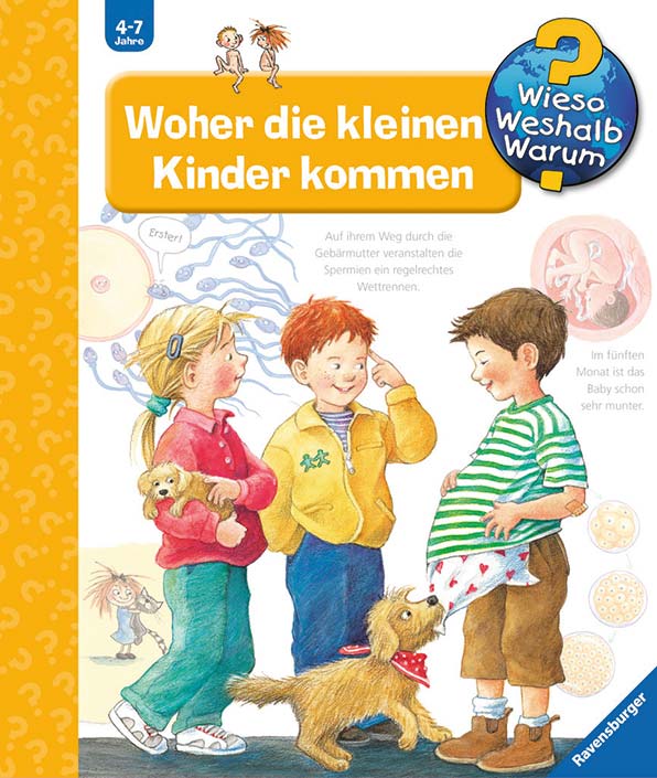 „Wer? Wie? Was? Wieso? Weshalb? Warum? Wer nicht fragt bleibt dumm“– diese Kinderliedzeilen können als Leitsatz für die Lehr- und Lernbuch-Endlosserie des Ravensburger Verlages betrachtet werden. Unter dem Label „Wieso? Weshalb? Warum?“ wird praktisch alles erklärt: Wie Autos funktionieren,worauf im Straßenverkehr geachtet werden muss, was Cowboys so machen. Da darf natürlich die spannende Frage „Woher die kleinen Kinder kommen“ nicht fehlen. Das Bilder-Sachbuch richtet sich an Kinder ab dem vierten Lebensjahr. Wie in allen anderen Büchern gibt es auch hier jede Menge Aufklappbilder. Was es heißt,„miteinander zu schlafen“, wird auf einer Seite gleich zu Beginn erklärt, danach dreht sich praktisch alles um die Kindswerdung. Warum boxt ein Baby im Bauch? Und wie entstehen Zwillinge? Am Schluss wird noch gezeigt, wie das Ganze bei Tieren funktioniert. Wir sind ja schließlich nicht alleine auf der Welt.
