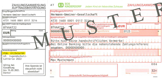 Einzahlungsbestätigung an SOS-Kinderdorf: