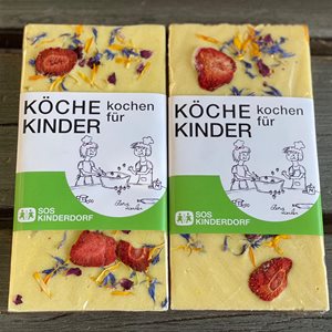 Ein wahres Genussstück für Augen und Gaumen ist die süße Komposition der Schokoladenmanufaktur Helmar Aufischer für das SOS-Kinderdorf. Weiße Schokolade mit Rosen, Korn- und Ringelblumen und als i-Tüpfelchen getrocknete Erdbeeren obendrauf. Da rinnt einem glatt das Wasser im Mund zusammen und das mit gutem Gewissen. Denn jeder Biss zaubert Kindern und Jugendlichen ein Lächeln auf die Lippen, da der Erlös der Schokolade dem SOS-Kinderdorf zu Gute kommt.