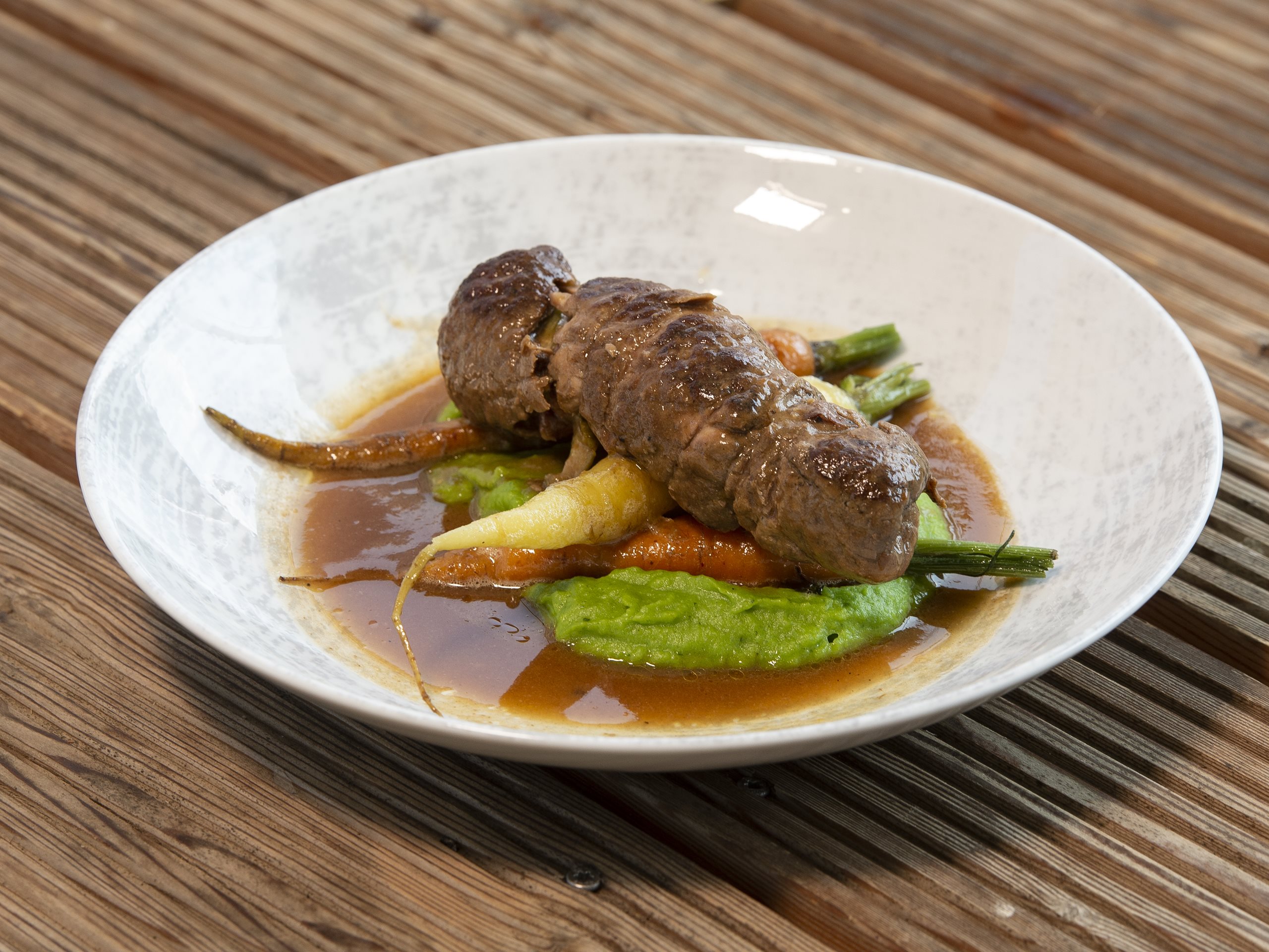 Rindsrouladen mit Kartoffelpüree und glacierten Baby Karotten