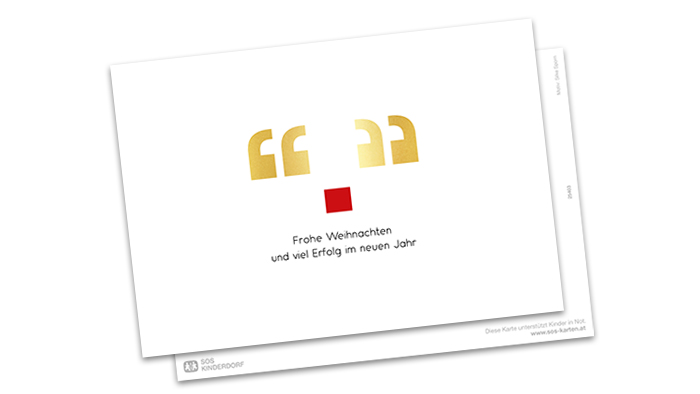 Mit den SOS-Weihnachtskarten schenken Sie Freude und kommunizieren gleichzeitig Ihr soziales Engagement! Denn mit jedem gekauften Billett helfen Sie wirkungsvoll - mindestens 50% Ihres Rechnungsbetrages kommen Kindern und Jugendlichen im SOS-Kinderdorf zugute. Alle Karten können mit eigenen Fotos, Logos, Texten und Schriften angepasst werden.
