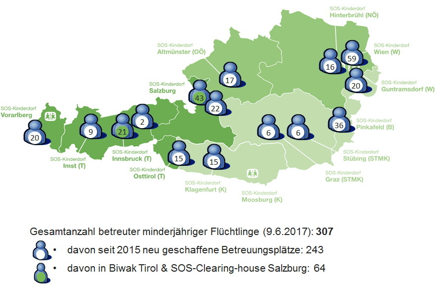 SOS-Kinderdorf macht bei der Betreuung von Kindern/Jugendlichen keinen Unterschied, egal wo jemand geboren ist. Das gilt auch für die österreichweit 307 minderjährigen Flüchtlinge, die aktuell von SOS-Kinderdorf betreut werden: in kleinen Wohneinheiten, mit gut ausgebildetem Fachpersonal, altersgerecht und Kinderrechte-gerecht!