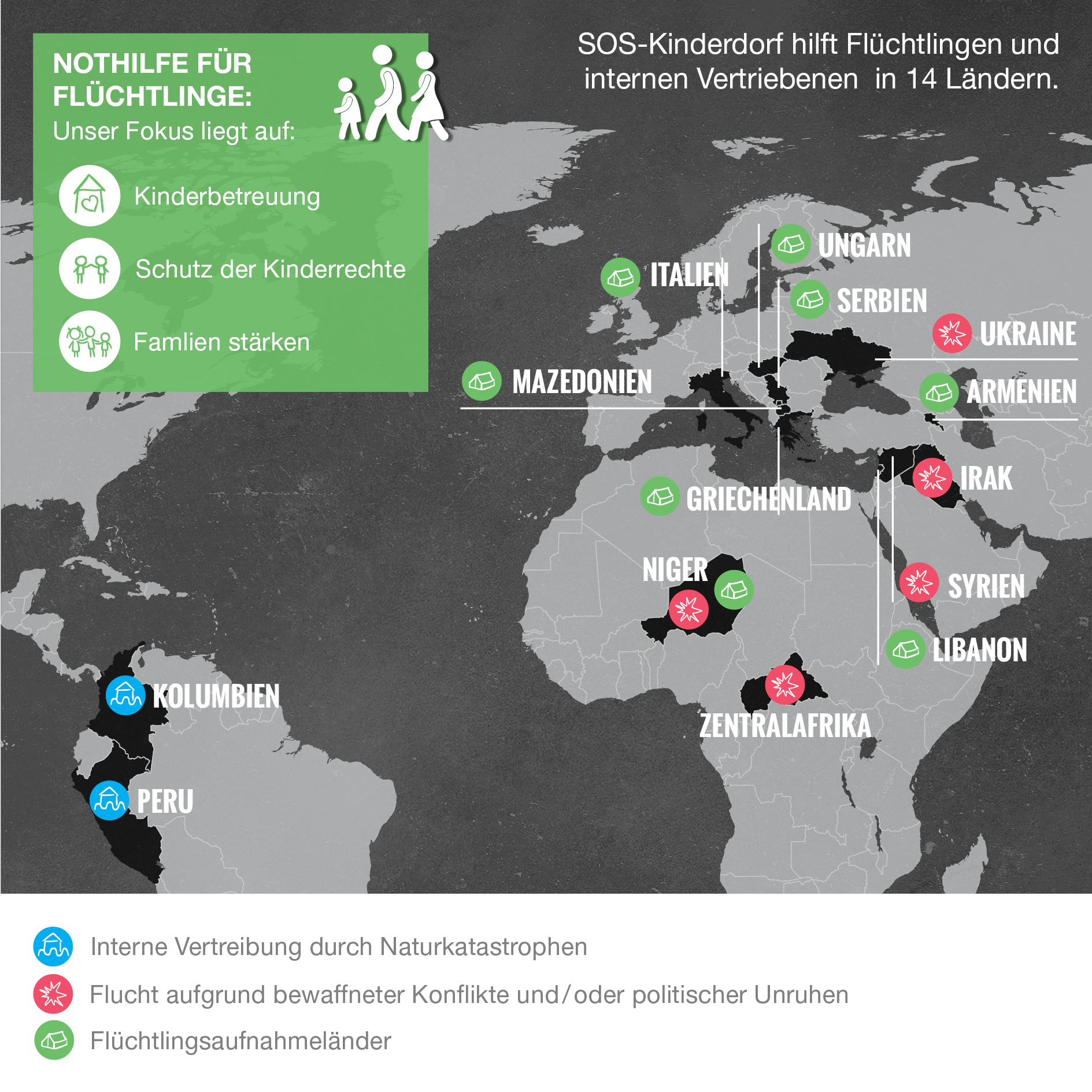Außerhalb von Österreich ist SOS-Kinderdorf International derzeit in 14 Ländern verstärkt für Flüchtlinge tätig: