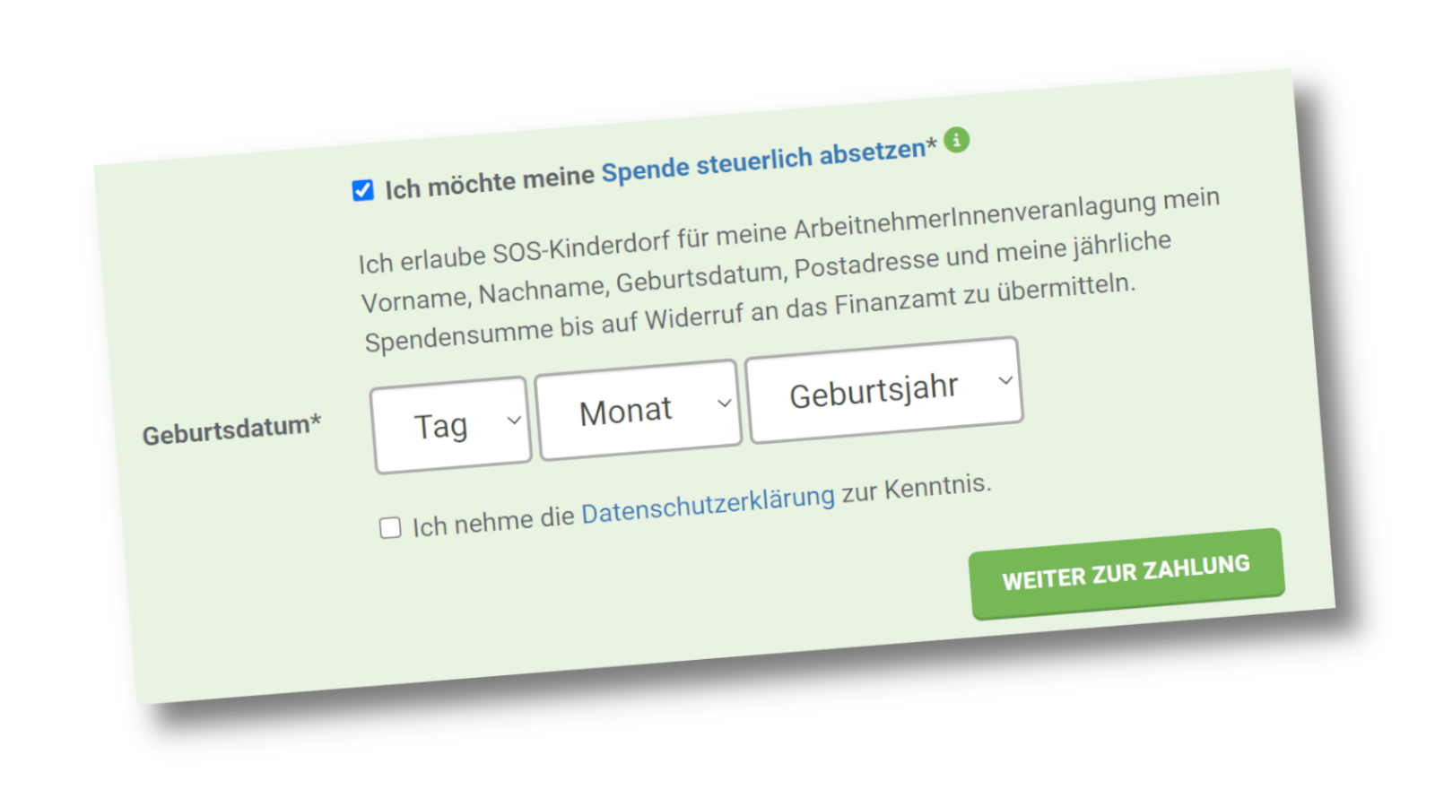 Wenn Sie online spenden oder eine Patenschaft abschließen, werden Sie im Spendenformular gefragt, ob Sie Ihre Spende steuerlich absetzen möchten. Sie können anschließend Ihr Geburtsdatum anfügen. Damit haben wir Ihr Einverständnis sowie alle erforderlichen Daten, um sie an das Finanzamt zu übermitteln, das Ihre Spende automatisch bei der nächsten Arbeitnehmerveranlagung berücksichtigt.