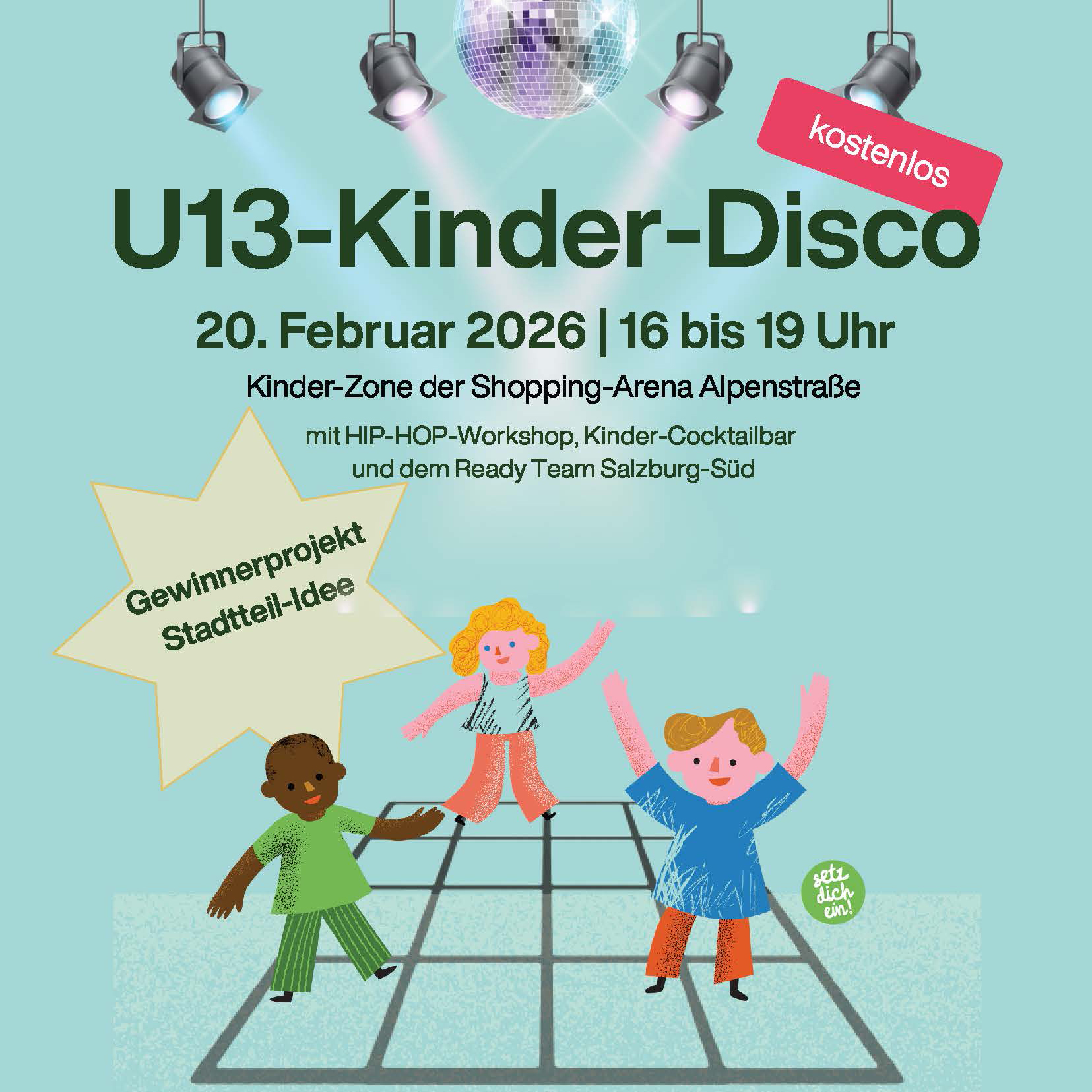 In der Kinder-Zone der Shopping-Arena Alpenstraße lädt das Ready Team Salzburg Süd Kinder von 7 bis 13 Jahren zu einer coolen U13-Kinder-Disco ein. Mit Hip-Hop-Workshop, DJ, Kinder-Cocktailbar und jeder Menge Beats zum Abtanzen!