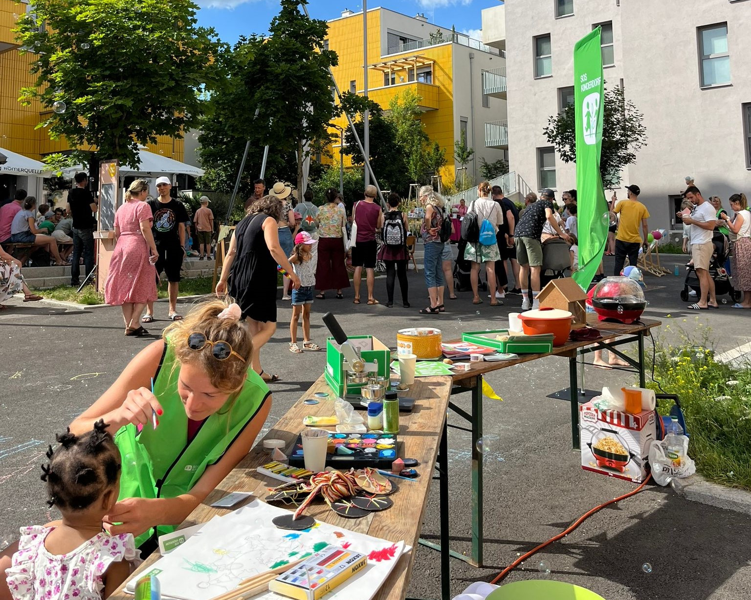 Grätzlfest - ein lebendiges Fest, um die Nachbarschaft zusammenzubringen! Am bunten Info- und Basteltisch hat das Ready Team Wildgarten im Akkord Kinder geschminkt – von Prinzessinnen und Löwen bis hin zu Spiderman und Marienkäfer. Auch mit der Buttons-Maschine hatten die Kinder und Jugendlichen sichtlich viel Spaß. Mit den Straßenmalkreiden wurde der graue Beton im Laufe des Nachmittags in einen bunten Platz verwandelt, und zu den Seifenblasen getanzt.